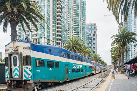 San Diego, JUN 29: Coaster amtrak and the historical Santa Fe station on JUN 29, 2018 at San Diego, California