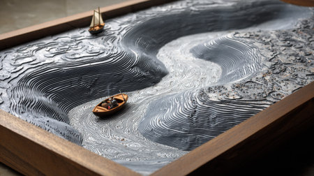 This sophisticated artwork features a winding river sculpted in intricate texture, with miniature boats gracefully navigating through a serene landscape. Perfect for adding a unique touch to your space.
