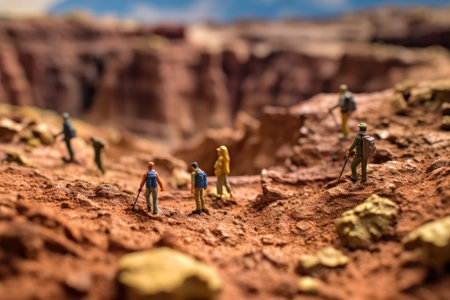 Selective Focus of Miniature, tourists walking on mountain top observation deck and enjoying nature landscapes. Tourism and traveling concept. Macro photo, shallow DOF