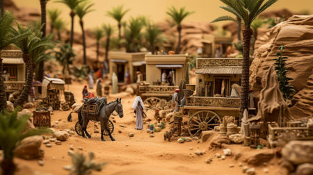 Roman merchant caravan traverses desert oasis with goods