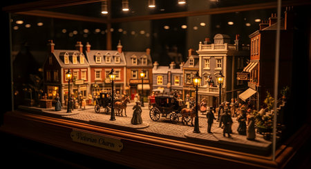 An exquisitely detailed miniature diorama, enclosed in a glass case, depicts a charming Victorian-era city street at night. The scene is complete with illuminated gas lamps, horse-drawn carriages, and tiny figures in period attire, showcasing incredible craftsmanship and historical artistry.