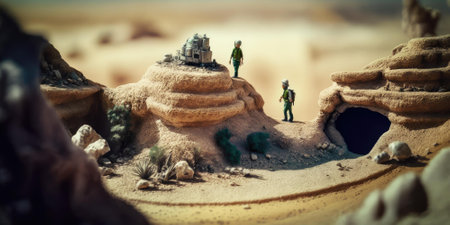 A miniature figure in black suit stands confidently on sandy mound, showcasing unique perspective
