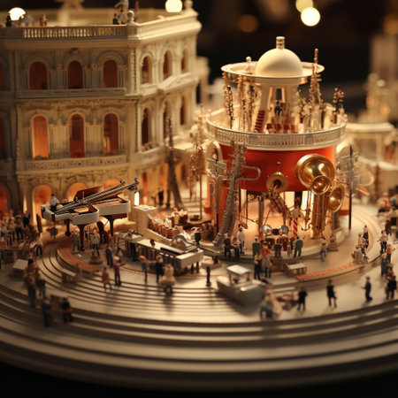 Get ready to be amazed by this visually stunning image of a miniature orchestra comprised of various model trains playing musical instruments in a grand concert hall! Each meticulously crafted train showcases different scales and styles, with intricate details that bring them to life. Positioned as if playing their instruments, the conductor train leads the symphony, while the audience members