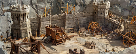 A medieval siege scene with wooden catapults and stone walls.