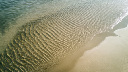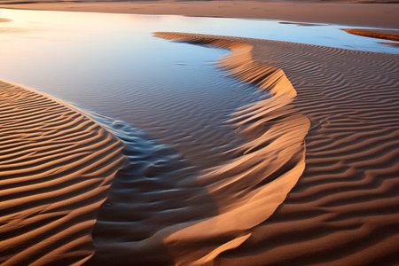 A wavy sand patterns create mesmerizing texture under sunlight, forming natural ripples and shadows. serene landscape evokes sense of calm and tranquility
