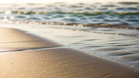 A stunning close-up view of gentle ocean waves caressing a sandy beach at sunset, creating beautiful textures and warm reflections on the water surface.