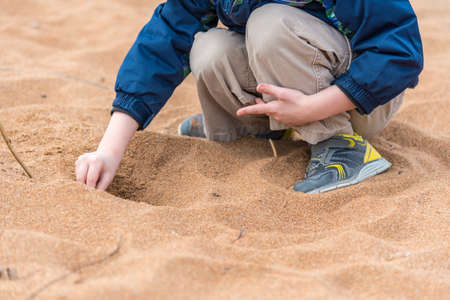 Preschool age boy sits in the sand and digs a hole with his hands
