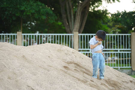 Asian boy about 3 year and 8 months playing with pile of sand and toy at public park