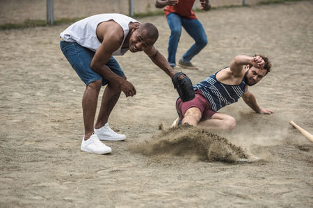 multiethnic men playing baseball on court