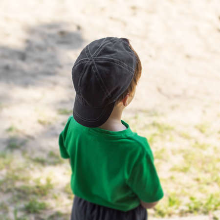 Childhood concept, little caucasian boy rear side view, outdoor portrait