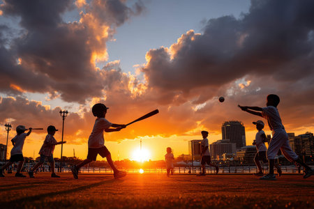 Kids swing baseball bats and run as the sun sets behind city buildings, creating a vibrant backdrop.