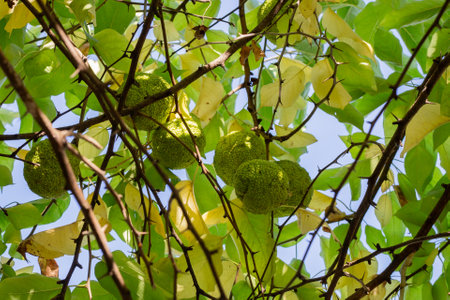 Maclura pomifera fruit or Adam apple growing on tree. Mulberry family (Moraceae).