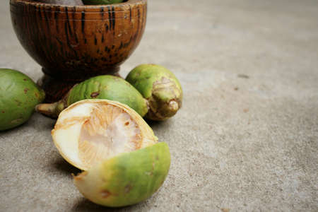 Tart taste santol, Wild sour santol and a leaf on wooden background