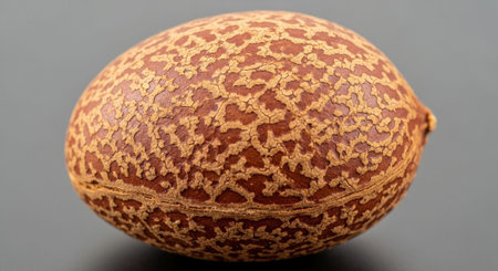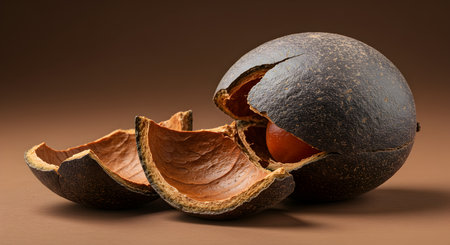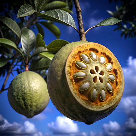 A captivating 3D illustration of a bael fruit. partially sliced open to reveal its intricate seeds. Perfect for illustrating articles on tropical fruits. Asian cuisine. or the benefits of bael.