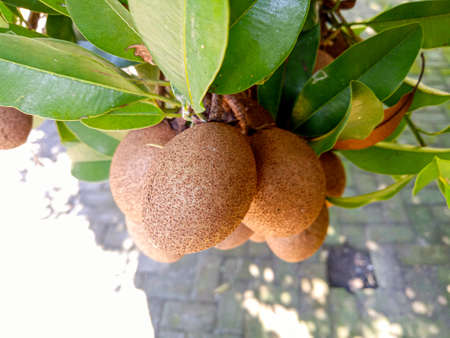 Manilkara zapota is the Latin name of the sapodilla manilla fruit, this brown fruit grows a lot in Southeast Asia, including in Indonesia. selective focus on leaves and fruit