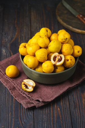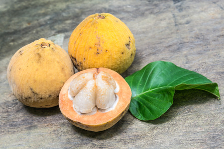 fresh sapodilla fruits on old wooden background. tropical fruits concept