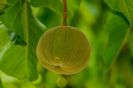 Light green fruit of White Champaka on branch and blur green leaves background, Thailand. Another name is White Sandalwood or White Jade Orchid Tree, Thailand.