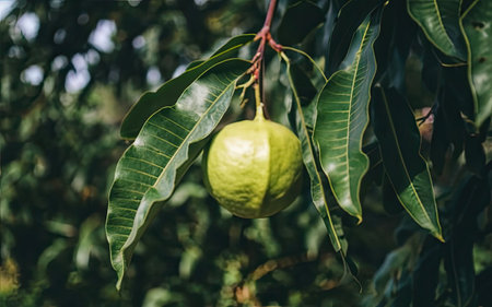 Close-up of fresh nutmeg on tree