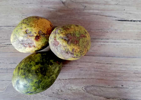Old,green and yellow,local Indonesian fruit namesKedondong,placed on the brown wooden background