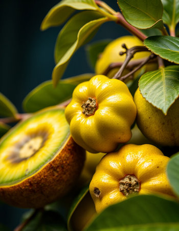 This captivating image showcases fresh sapodilla fruits displayed on a rustic background, highlighting the smooth texture and sweet interior of this tropical delight.