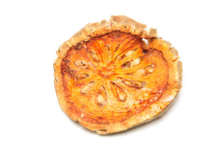 Slices of dried bael fruit isolated