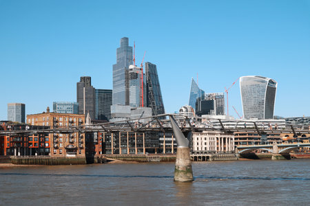 London, United Kingdom - August 10, 2022: View of the City of London skyline with Millennium Bridge over the River Thames