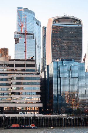 London, United Kingdom - August 11, 2022: Modern skyscrapers of the City of London seen across the River Thames at sunset