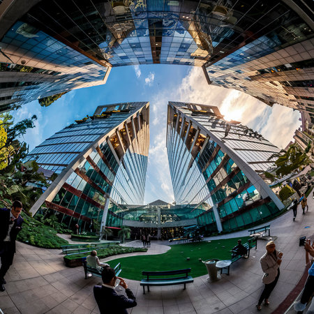 Architectural photograph depicts several contemporary high-rise buildings. The image, captured from a low angle, features structures of glass and steel under a clouded sky. The composition emphasizes lines and form, potentially suitable for design, business, or urban planning concepts, providing a backdrop for creative or editorial endeavors.