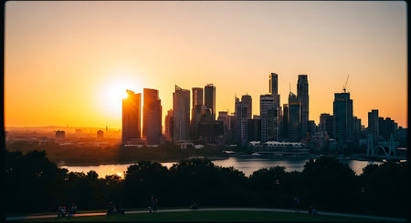 A panoramic view of a modern city skyline at sunset, featuring tall skyscrapers reflecting the warm colors of the sky, with a river in the foreground