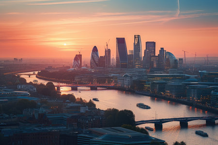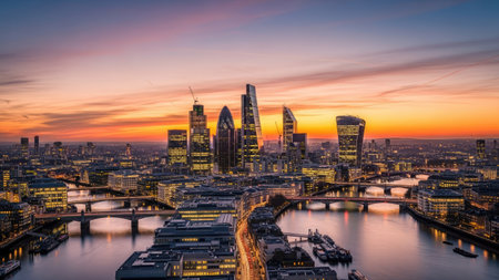 Aerial view of the city of London at sunset, UK, Photo of London skyline at sunrise, AI Generated
