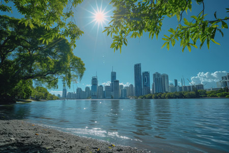 A bright sun illuminates the bustling city skyline, casting a warm glow over the urban landscape, Brisbane's skyline glittering in the midday sun, AI Generated