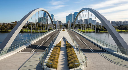 A sleek modern bridge showcases innovative architecture in an urban environment. The image captures leading lines and a serene atmosphere under a cloudy sky.