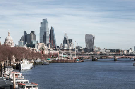 London, UK - February 23, 2021: City of London financial district view from the Embankment. View include river Thames, St, Pauls cathedral