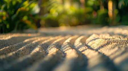 A mesmerizing close-up view of textured sand dunes illuminated by soft lighting, showcasing the intricate patterns and warm tones of a serene coastal environment.