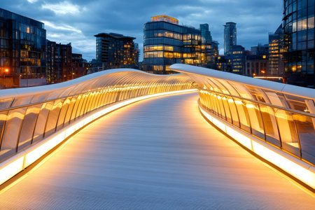 Modern architecture and urban design illuminated pedestrian bridge at twilight