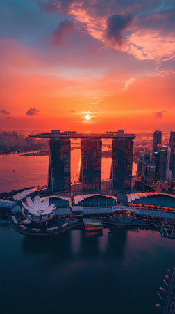 A beautiful sunset over a city with three tall buildings. The buildings are lit up at night, creating a warm and inviting atmosphere. The water in the background adds to the serene