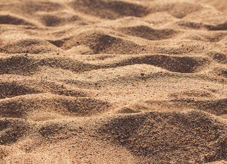 Close up of clean yellow sand surface covering seaside beach illuminated with day light. Travel and vacations concept