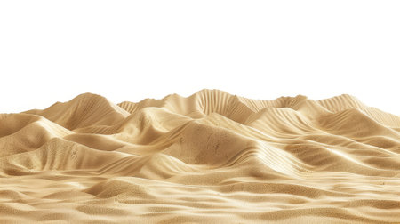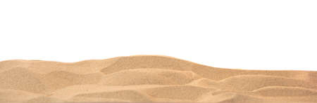 Pile Sand Isolatd on White Background. macro small heap mountain Desert Dry Sandy Beach at Coast of Sea Shore. particle striped texture nature. Tropical Summer Travel Holidays and Environment concept.