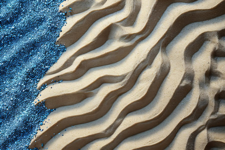 Fine golden grains form intricate ripples on arid terrain, reflecting sunlight under a bright blue sky, ideal for nature, travel, or background themes