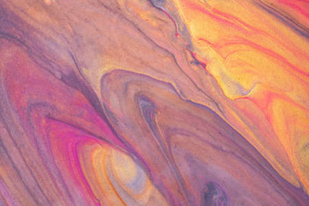 Abstract fluid art background purple and golden colors. Liquid marble. Acrylic painting with violet gradient and splash. Watercolor backdrop with wavy pattern. Stone marbled section.