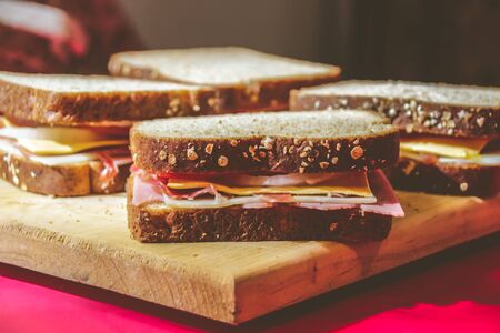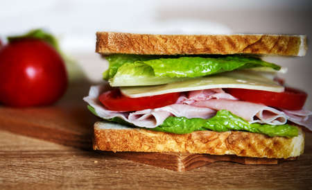 Triangular shaped sandwich with ham, vegetables and mayonnaise on a wooden platter. Summer outdoor event menu. Horizontal photo