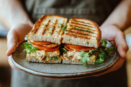 A person holds a plate featuring a layered sandwich filled with lettuce, tomato, and a fried egg, all nestled between toasted bread. The sandwich looks fresh and appetizing.
