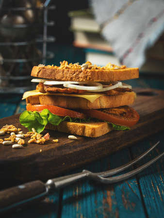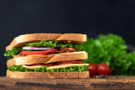 Sandwich with tomato, onions and bacon on a vintage wooden background in rustic style. Toned.