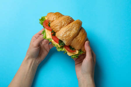 women hand pick Sandwich with ham, cheese, tomatoes,,