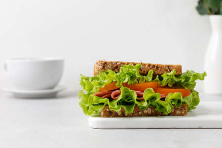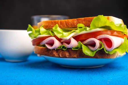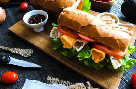 Very tasty big sandwich with ham or balyk, arugula, cheese, tomatoes and mayonnaise on a cutting board in rustic style on gray background view from the top, copy space