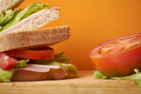 Healthy ham and cheese sandwich with tomato and lettuce in orange background