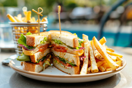 Close-Up of Delicious Club Sandwich with Fresh Vegetables and Crispy French Fries by the Poolside.