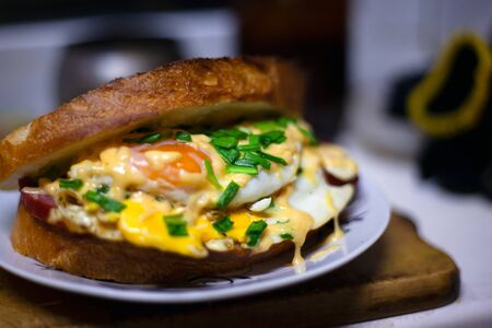 roasted sandwich with sausage, egg, cheese and green onions. juicy double toast bread sandwich.