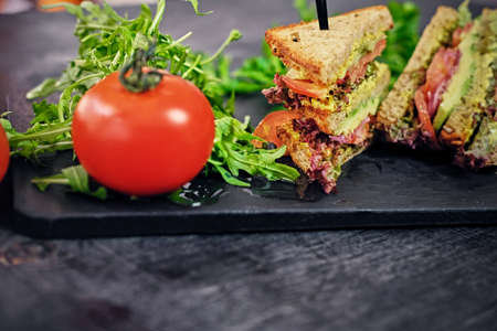 Tasty and fresh sandwiches on a dark wooden background, close-up