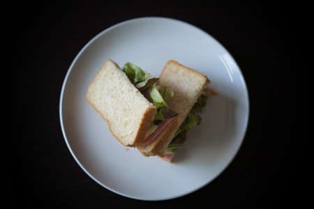 Top view of Healthy Sandwich toast with lettuce, ham, cheese and tomato on a wooden background